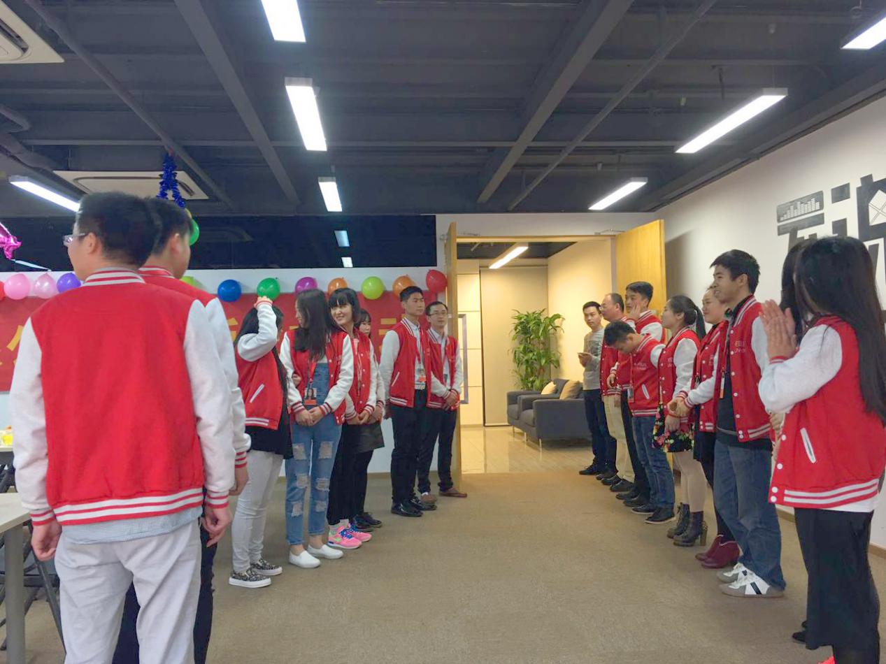 推开门就能看见充满喜庆的庆生会场,这可是技术部的宋依侬精心策划的喔~我们排成两列为新员工进行入职欢迎仪式,