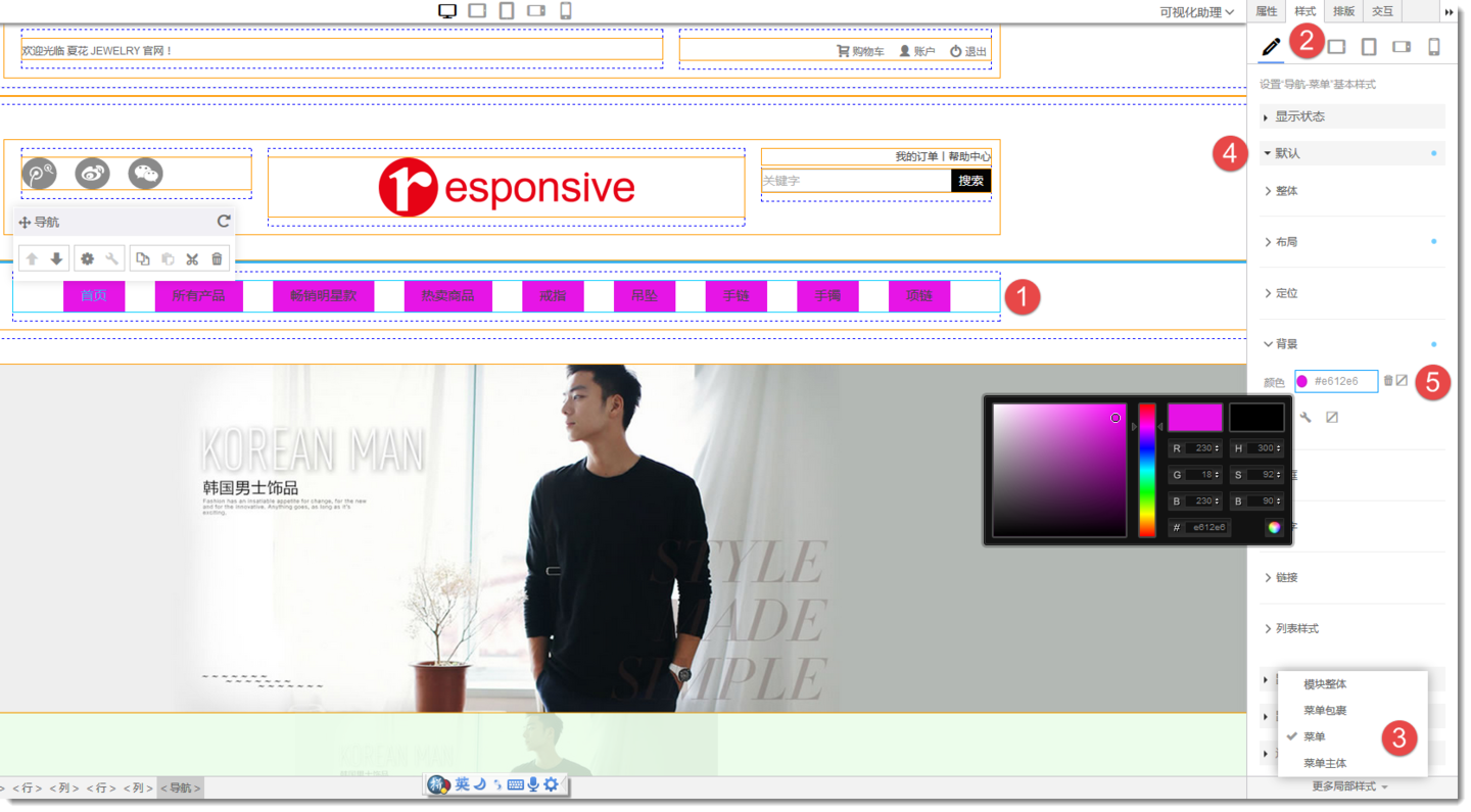 1. 选中导航栏。2. 打开样式面板。3. 在样式面板最下方点击更多局部样式,在弹出的选项中选中菜单包裹。4. 去上访点击默认。5. 在下方的背景设置项中选择一个背景颜色。6. 设置颜色后点击页面左上角的保存页面设置按钮即可。