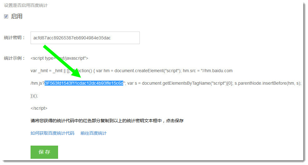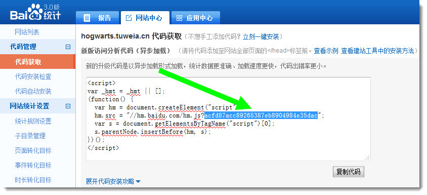 1. 在百度统计网站上注册帐号后登录。2. 添加网站时,填写网站在突唯阿的二级域名。3. 登录后在网站中心上点击,点击左侧代码获取,然后在右侧复制高亮显示的这段代码。4. 在突唯阿网站管理后台顶部统计菜单下方点击访问统计选项,然后在弹出的页面中启用百度统计功能。然后把刚才复制的代码粘贴在统计密匙后的填充框中。