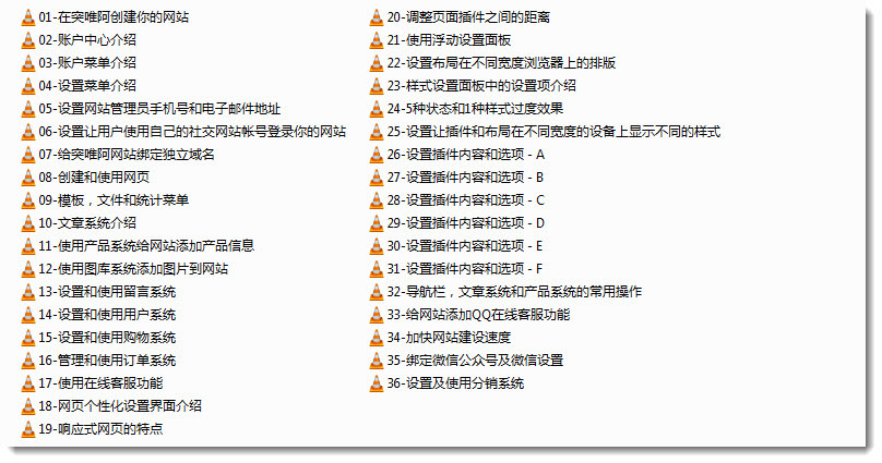 突唯阿视频教程正式发布用户现在可以在这里下载超清版的视频教程(高清视频1、高清视频2)。也可以去土豆视频网站在线观看视频。熟悉使用突唯阿平台创建网站。建议新用户和老用户都先花几个小时的时间把视频教程从头到尾看完,然后去设置网站。这样在设置网站的时候知道什么样的页面效果用什么样的插件实现,以及如何实现这些效果。另外,完整看过一遍视频后还可以在设置网站过程中遇到问题时知道这样的问题在视频教程中有没有相关解释。这样用户能够自己借助视频教程和帮助网站解决遇到的问题。